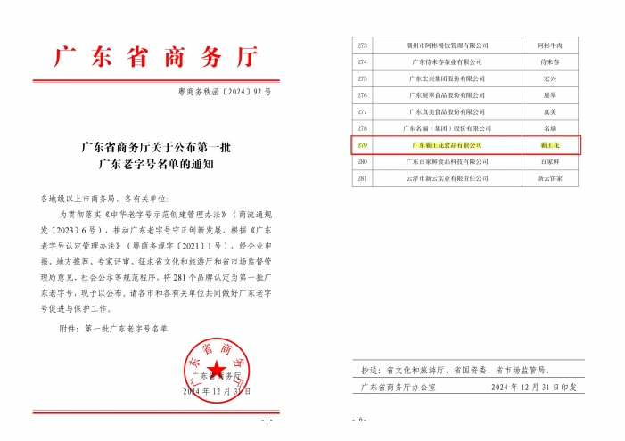 廣東霸王花食品有限公司認定為廣東老字號