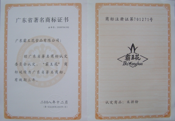 廣東省著名商標證書